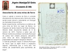 Documento do mês de abril de 2008, que teve como objeto de divulgação o documento "Descoberta de Minas, 8 de janeiro de 1877", cx. A.158, do Fundo da Câmara Municipal de Tavira.