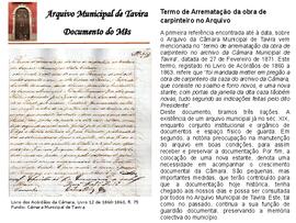 Documento do mês de julho de 2008, que teve como objeto de divulgação o documento "Termo de Arrematação da obra de carpinteiro no Arquivo", que consta do Livro dos Acórdãos da Câmara, Livro 12 de 1860 - 1863, fl.75, do Fundo da Câmara Municipal de Tavira.