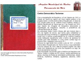 Documento do mês de outubro de 2009, que teve como objeto de divulgação o documento "Centro Democrático Tavirense",respeitante ao Livro de Inscrição de Sócios do Centro Democrático Republicano de Tavira, 1911, do Fundo da Câmara Municipal de Tavira.