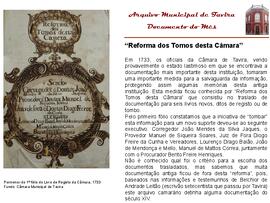 Documento do mês de novembro de 2009, que teve como objeto de divulgação o documento "Reforma dos Tomos desta Câmara", respeitante à Pormenor do 1º fólio do Livro de Registo de Câmara, 1733, do Fundo da Câmara Municipal de Tavira.