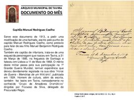 Documento do mês de junho de 2015, que teve como objeto de divulgação o documento "Capitão Manuel Rodrigues Coelho”, respeitante o processo das Obras Particulares Antigas, 18/12/1913, Cx. 3-A, mç 4, do Fundo da Câmara Municipal de Tavira.
