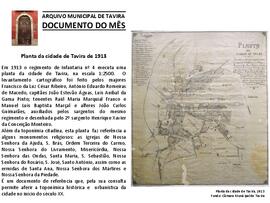 Documento do mês de fevereiro de 2016, que teve como objeto de divulgação o documento "Planta da cidade de Tavira de 1913”, respeitante à Planta da cidade de Tavira, 1913, do Fundo da Câmara Municipal de Tavira.