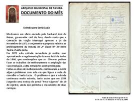 Documento do mês de agosto de 2017, que teve como objeto de divulgação o documento "Estrada para Santa Luzia”, do Fundo da Câmara Municipal de Tavira, Sc: M / Ssc: A / Sr: 002 ,Cx. A.372, mç. 0045.