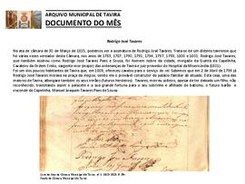Documento do mês de março de 2019, que teve como objeto de divulgação o documento "Rodrigo José Tavares", respeitante à Ata , que consta do Livro nº 1, 1813-1823, fl. 29v. de Atas da Câmara Municipal de Tavira, do Fundo da Câmara Municipal de Tavira.