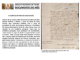 Documento do mês de novembro de 2019, que teve como objeto de divulgação o documento "A residência do Padre de Santo Estevão", respeitante à Correspondência recebida da Câmara Municipal de Tavira, 20 de Novembro de 1845, A. 166, do Fundo da Câmara Municipal de Tavira.