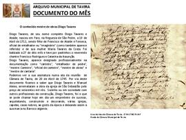 Documento do mês de junho de 2020, que teve como objeto de divulgação o documento "O conhecido mestre de obras Diogo Tavares“ , que consta do Livro de Atas da Câmara de Tavira, 1744 -1748, fl.14v., do Fundo da Câmara Municipal de Tavira.